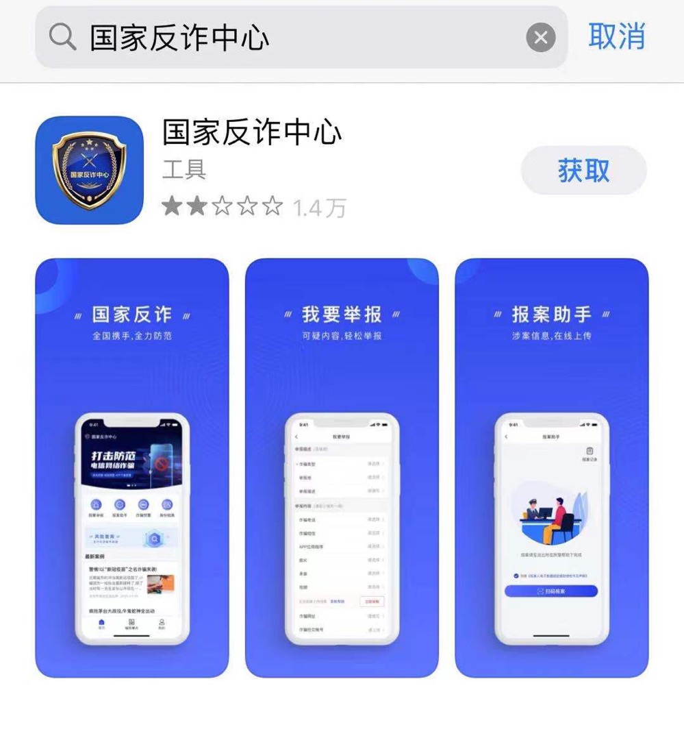 1、在各大官方應用商店搜索“國家反詐中心”并下載
