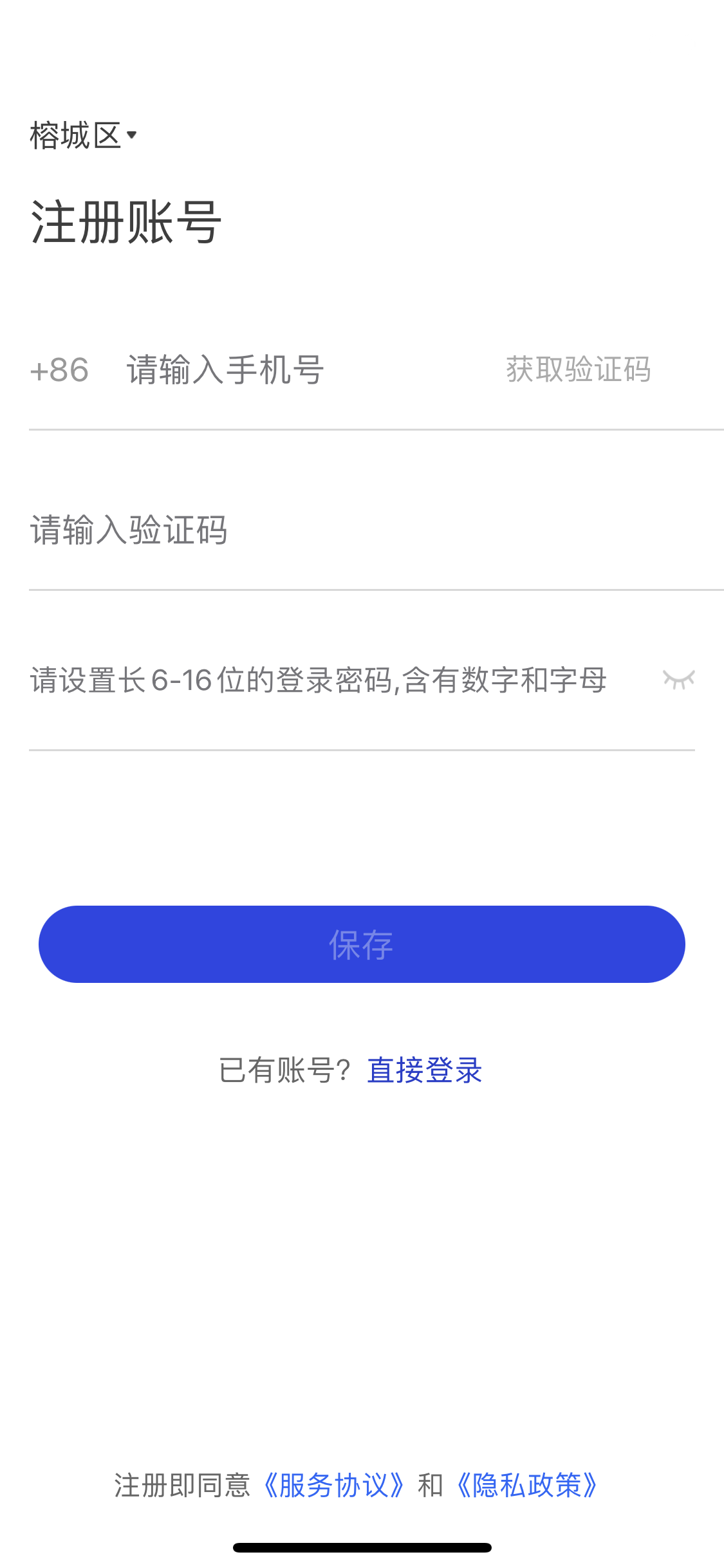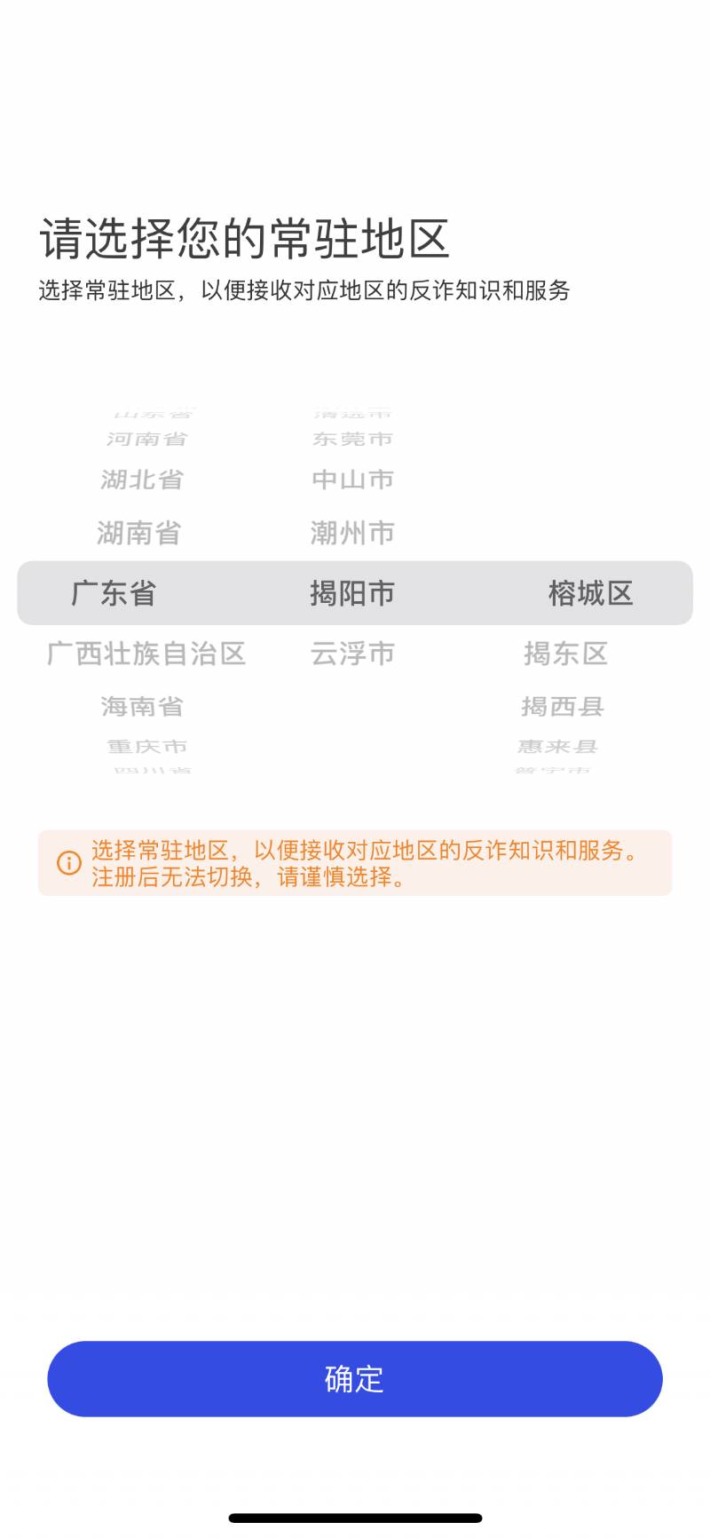 2、進入APP后,首先選擇常駐地區(qū)完成注冊,然后進入登錄頁面,點擊“快速注冊”。完善個人賬號信息后并保存。